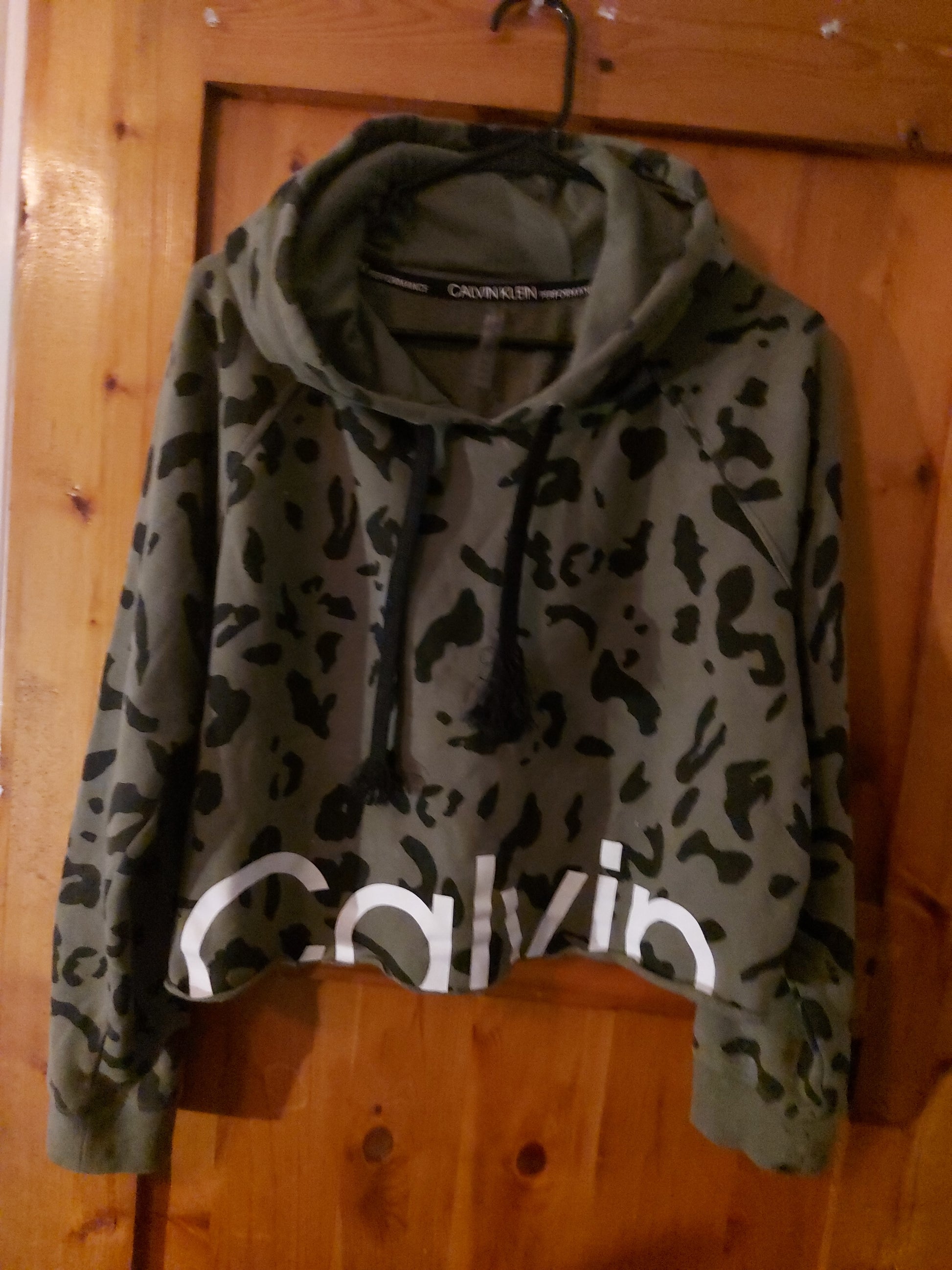 This is a Calvin Klein hoodie with a stylish camo print, perfect for casual wear or workouts! This cropped hoodie is a youth large. The hoodie has been previously enjoyed and is in good condition, ready to add a bit of flair to your wardrobe.
