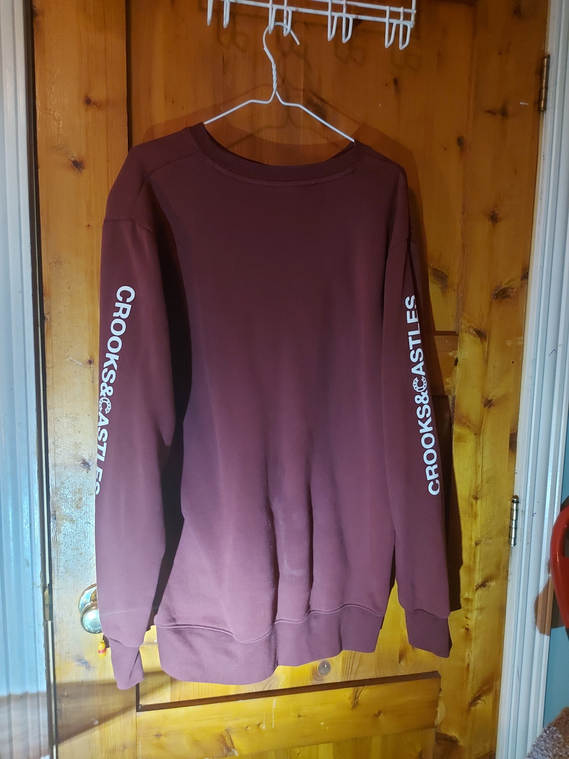 Snag this used Crooks & Castles sweater, a unique statement piece for your wardrobe. It's a size large and features a distinctive clock and chain design, perfect for adding an urban edge to your look. This sweater has been worn, which only adds to its character and street-style appeal.